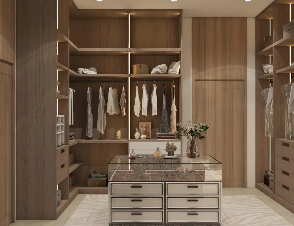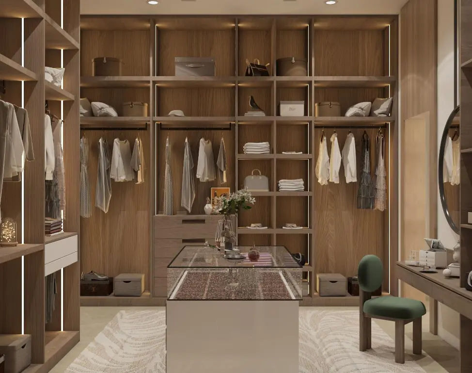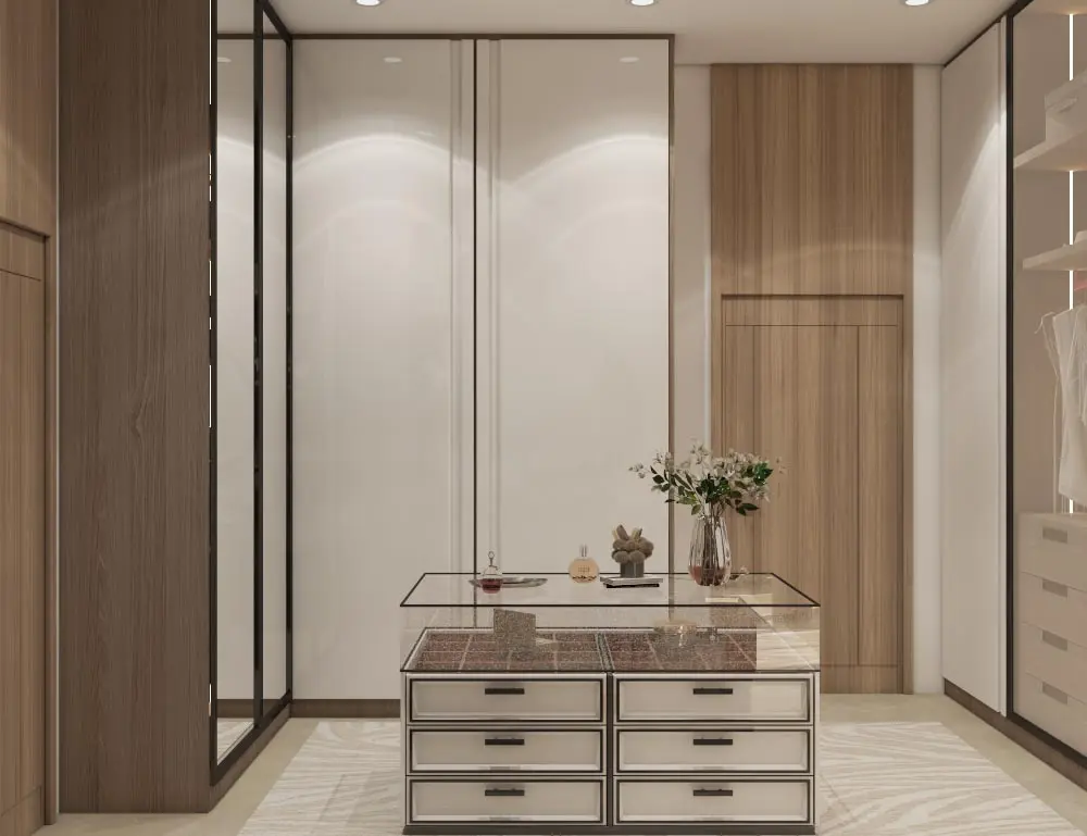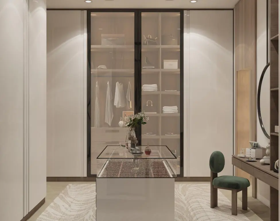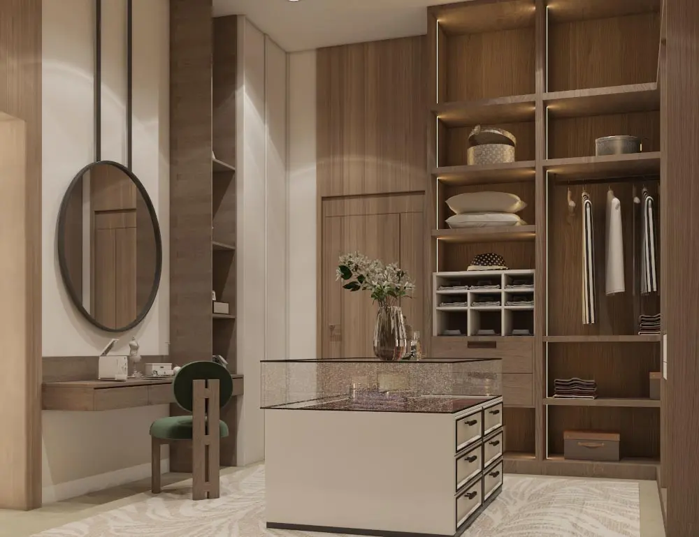 - Sophisticated Dressing Room: Built-in wardrobes with integrated lighting, a central island with wooden accents, and a chic vanity station create a stylish and functional space.