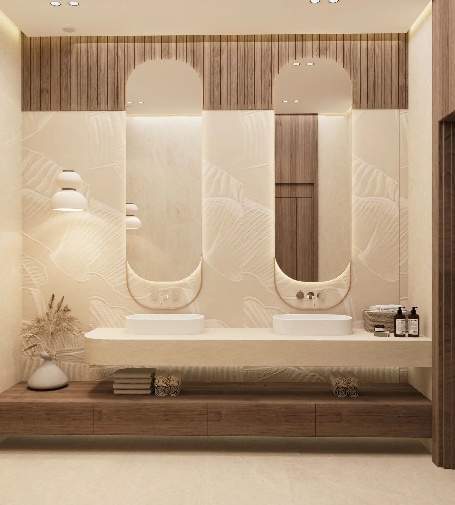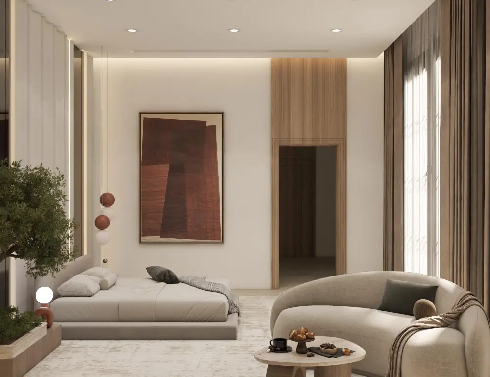 With a warm neutral palette, rich textures, and natural materials, this space exudes refined simplicity. Thoughtfully curated décor and soft ambient lighting create a harmonious, inviting atmosphere—offering a timeless retreat for contemporary living.