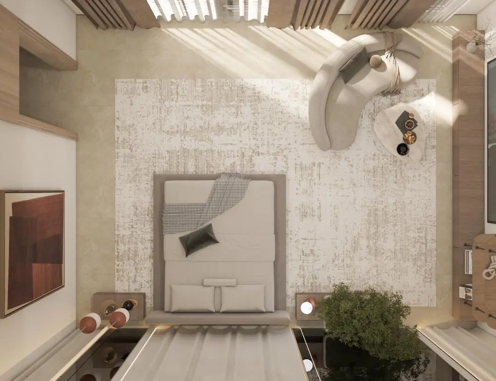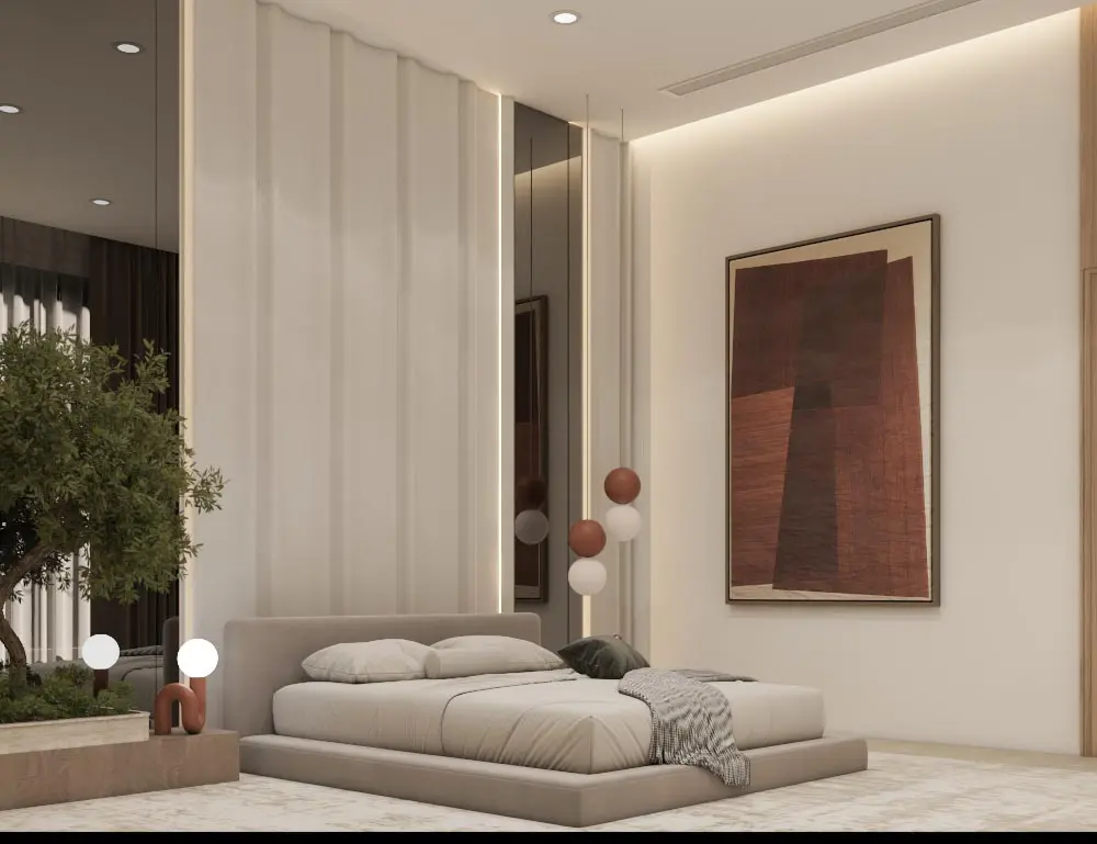 - Serene Bedroom: A peaceful retreat with a plush upholstered bed, layered linens, and warm neutral tones. Wooden nightstands and soft ambient lighting enhance relaxation and comfort.