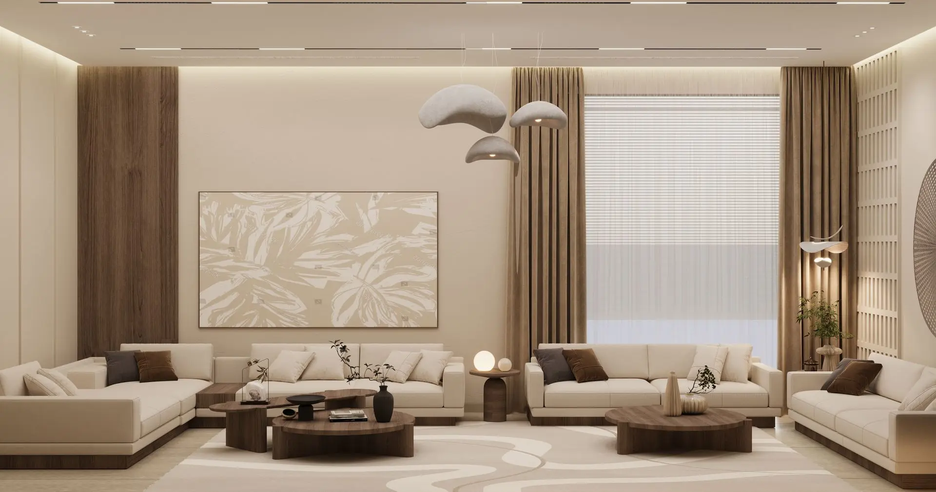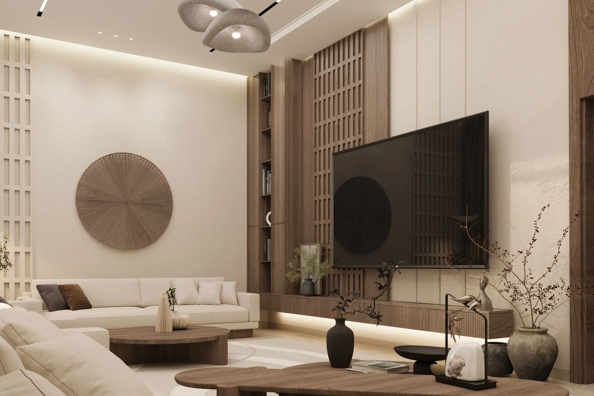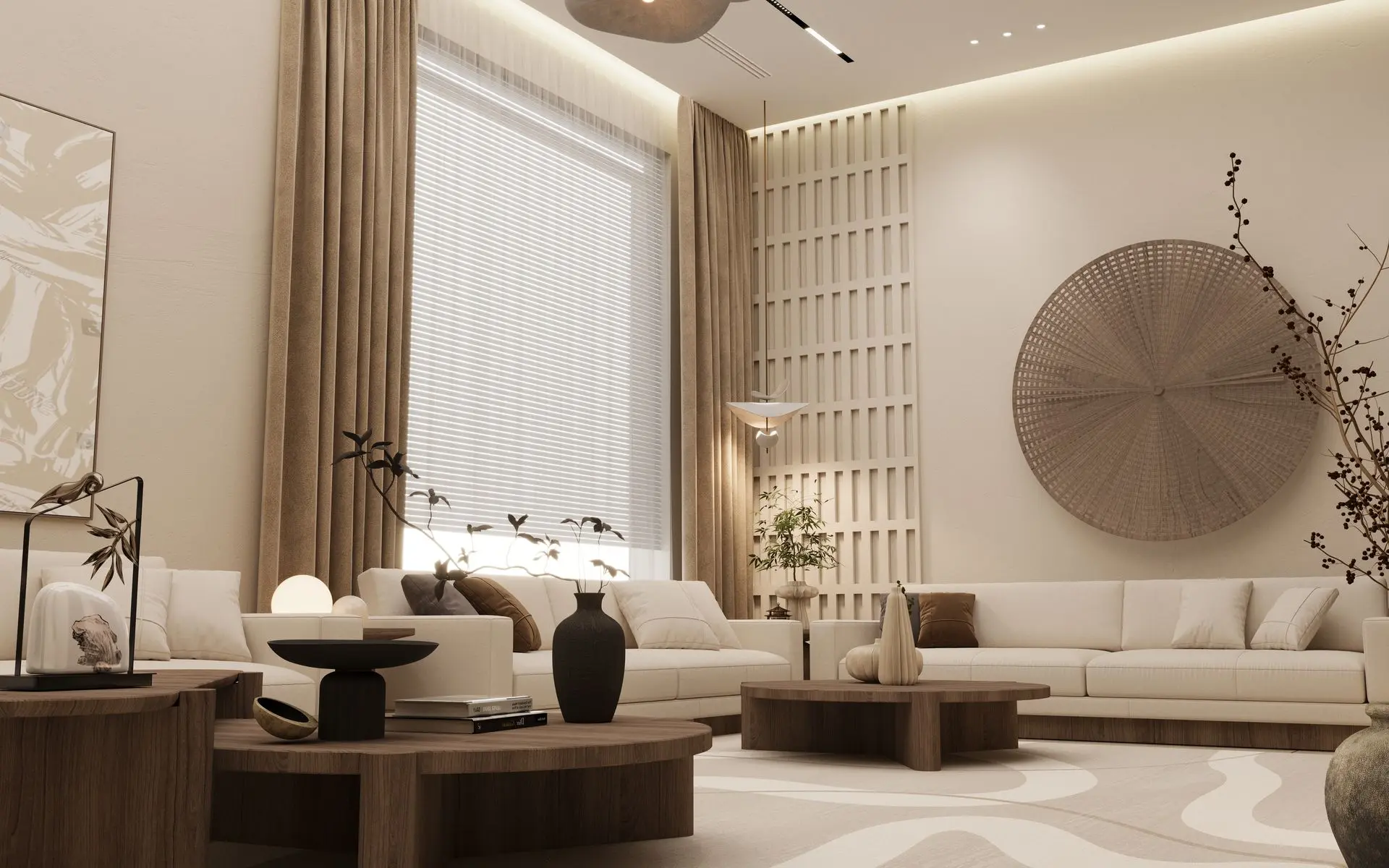 - Elegant Living Room: Cream-colored sofas, wooden coffee tables, and sculptural décor set a refined tone. A woven wall piece and ambient lighting add warmth and sophistication.