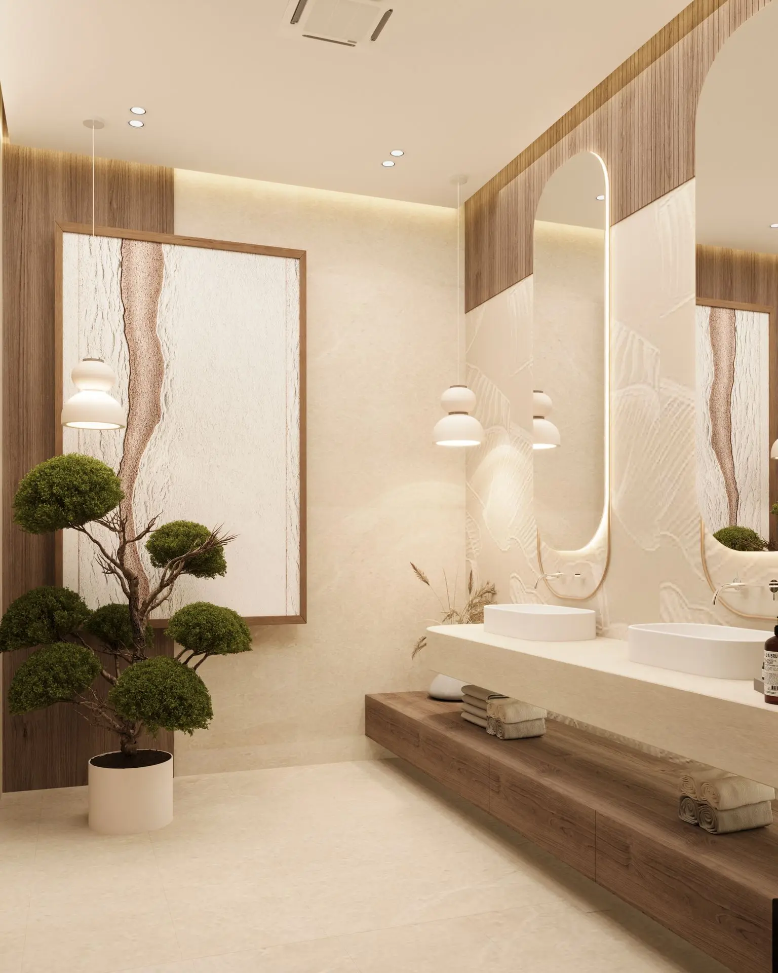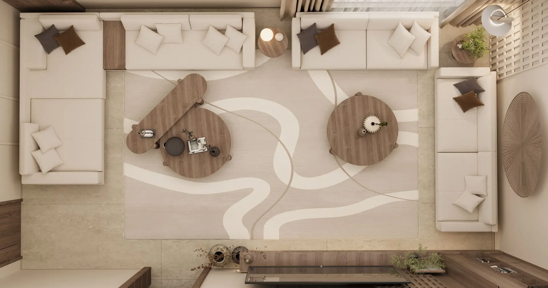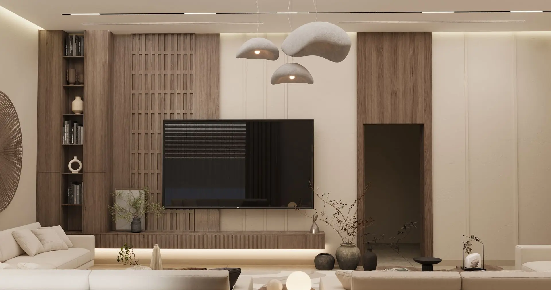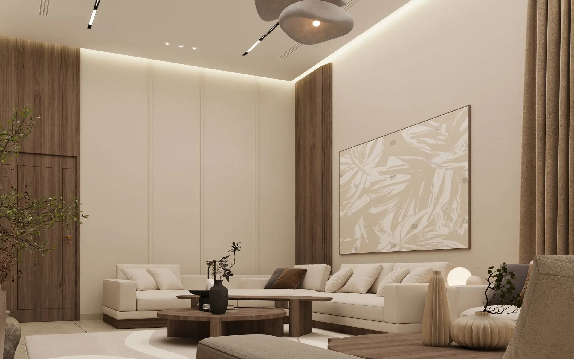 - Elegant Living Room: Cream-colored sofas, wooden coffee tables, and sculptural décor set a refined tone. A woven wall piece and ambient lighting add warmth and sophistication.
