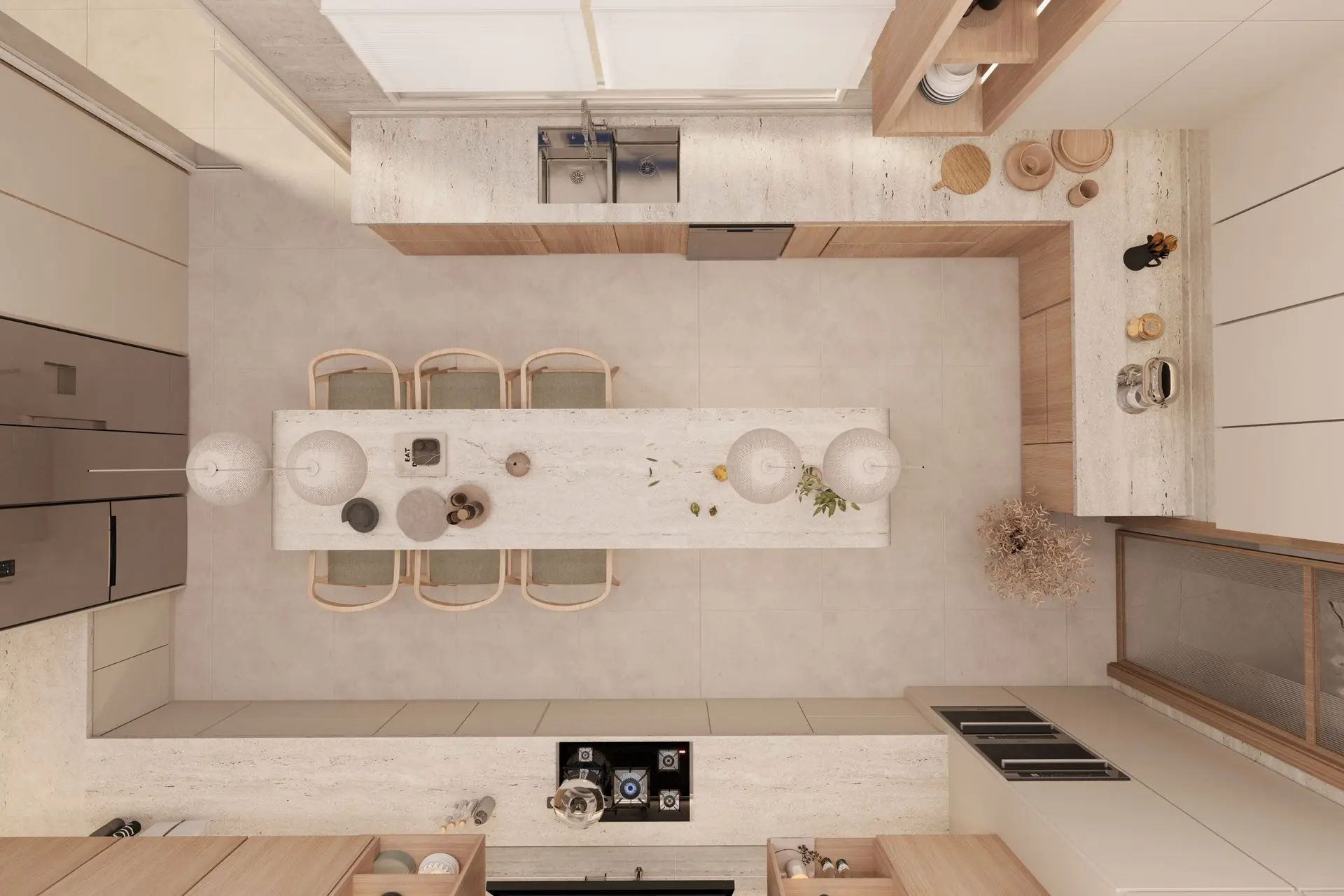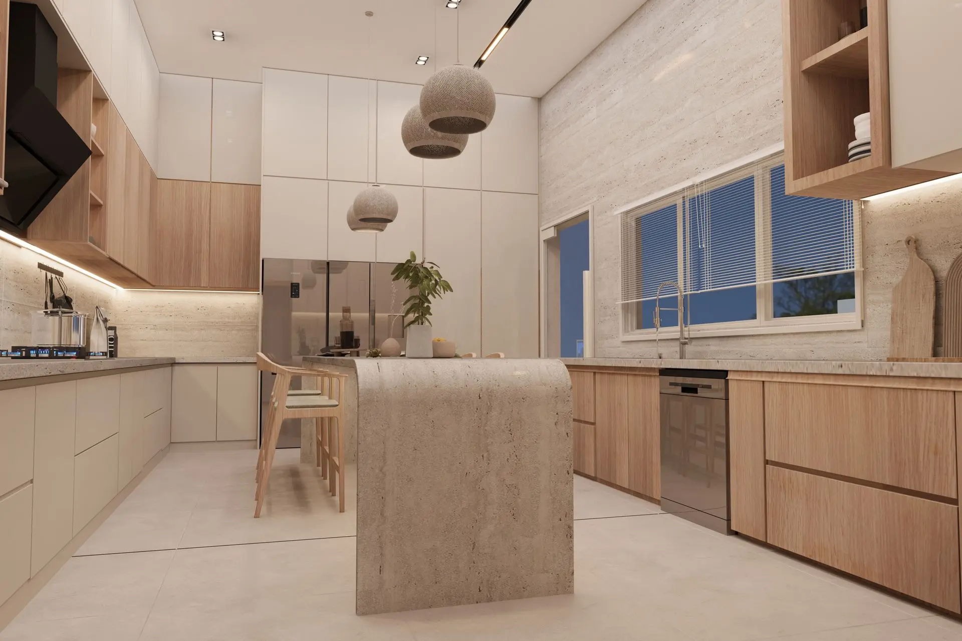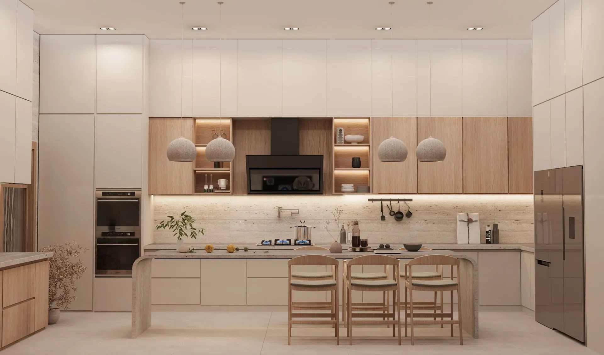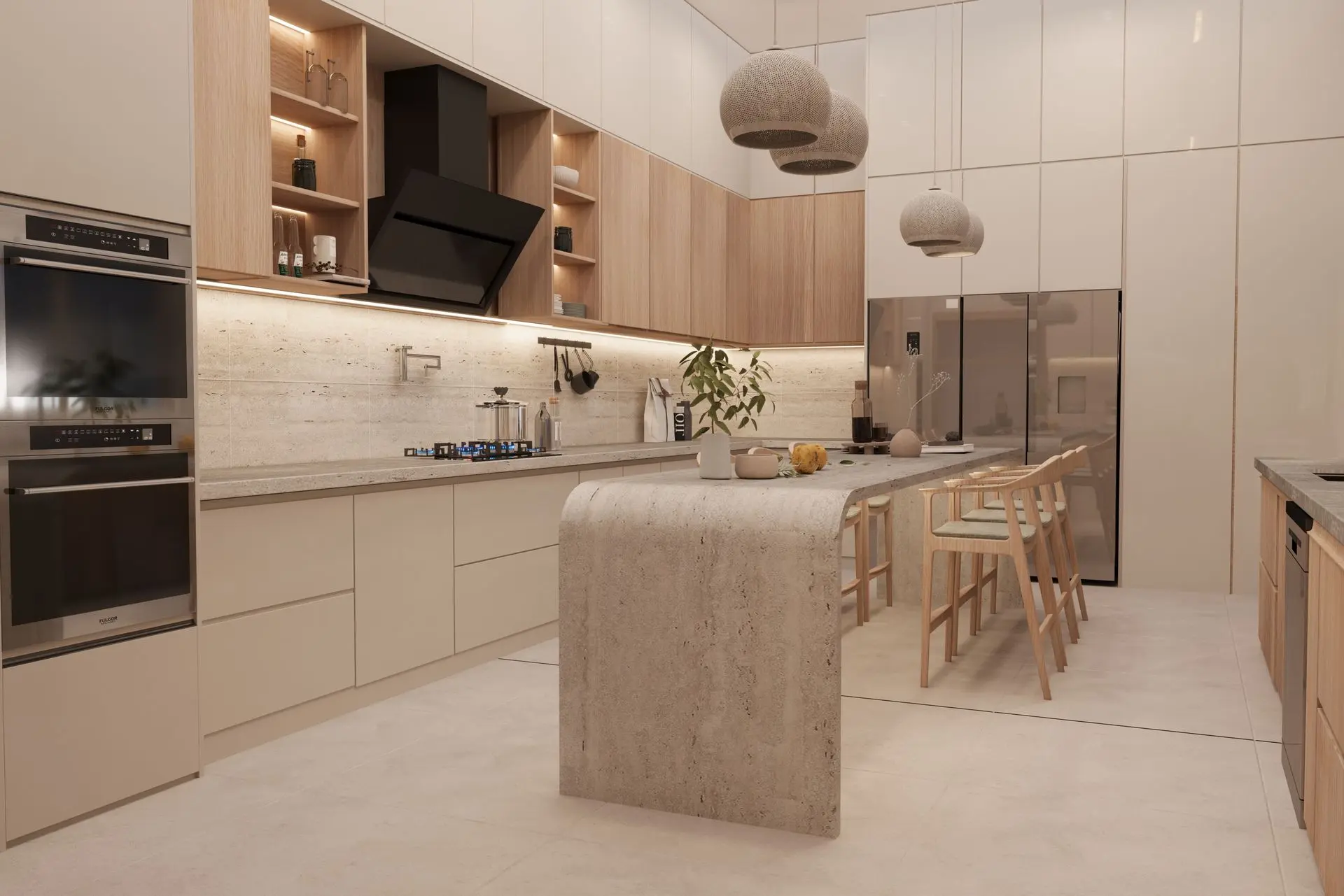 - Minimalist Kitchen: Seamless cabinetry, stone countertops, and an oversized island offer both style and function. Pendant lighting and wooden accents complete the sleek, modern look.