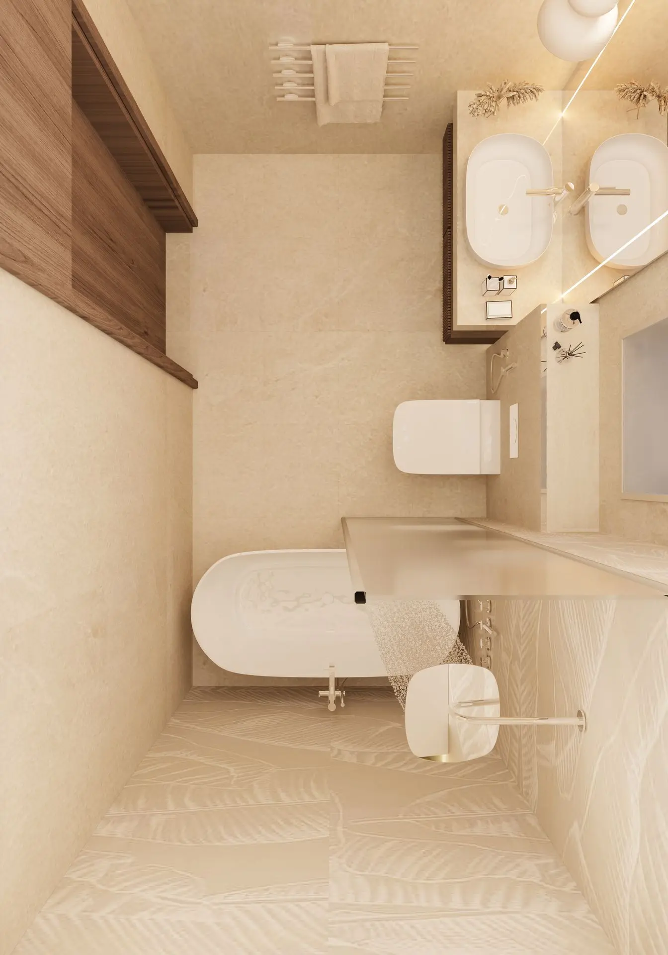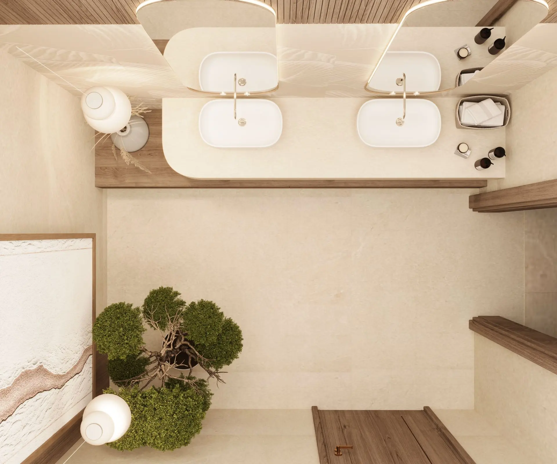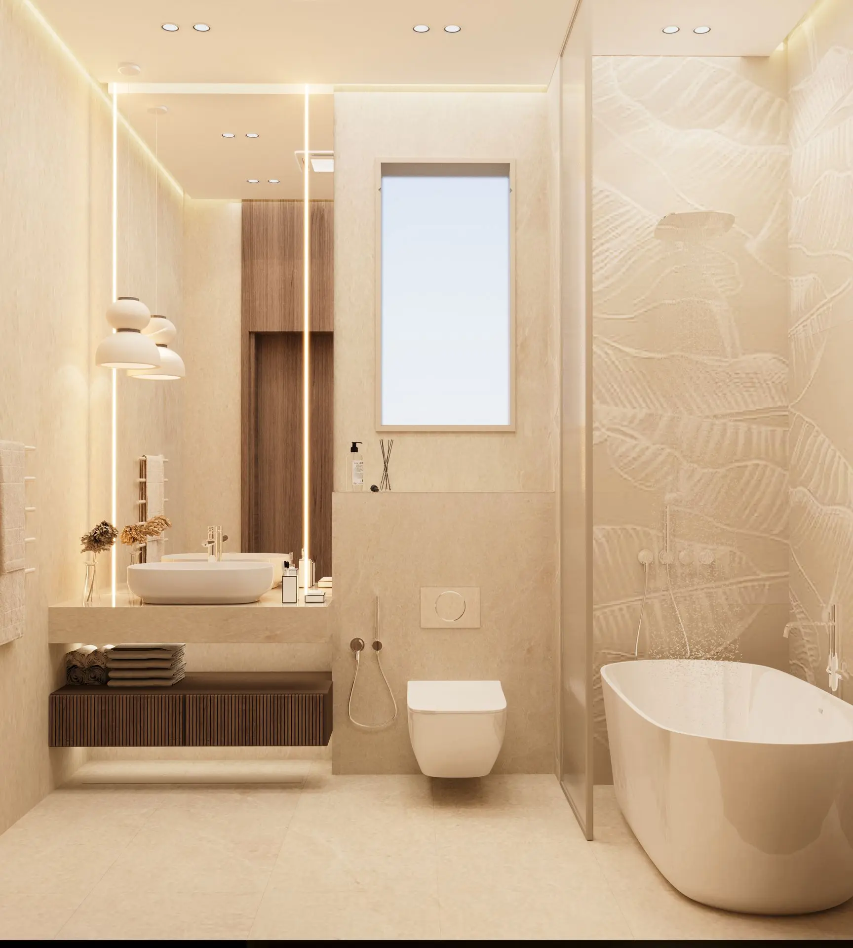 - Spa-Like Bathroom: A freestanding bathtub, floating wooden vanities, and black metal fixtures create a serene escape. Soft lighting and greenery enhance the spa-like ambiance