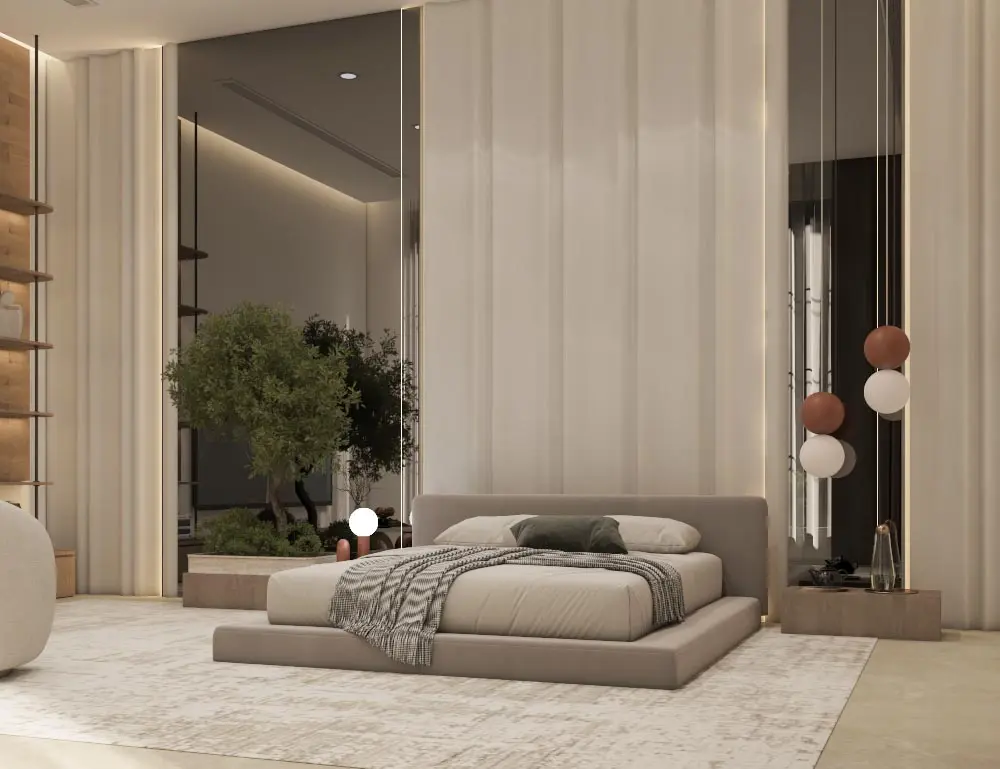 - Serene Bedroom: A peaceful retreat with a plush upholstered bed, layered linens, and warm neutral tones. Wooden nightstands and soft ambient lighting enhance relaxation and comfort.